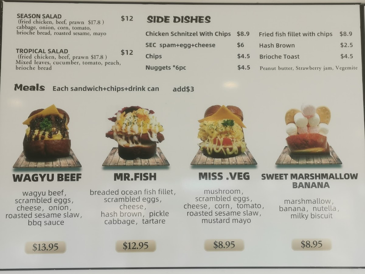 Brioche Sandwiches: This category includes different sandwiches served on brioche bread with fillings such as bacon with scrambled eggs and cheese, ham and spam with scrambled eggs and mustard mayo, vegetarian options with mushrooms and corn, and chicken schnitzel with various condiments and slaw.