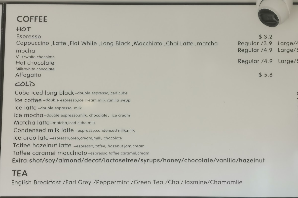 Cold Drinks: This category includes a range of iced coffee and tea beverages, such as iced long black with double espresso, iced chocolate, iced coffee with ice cream and vanilla syrup, iced latte, iced mocha, iced matcha latte, condensed milk latte, iced oreo latte, and hazelnut lattes. These drinks highlight espresso-based and milk-based cold options.
